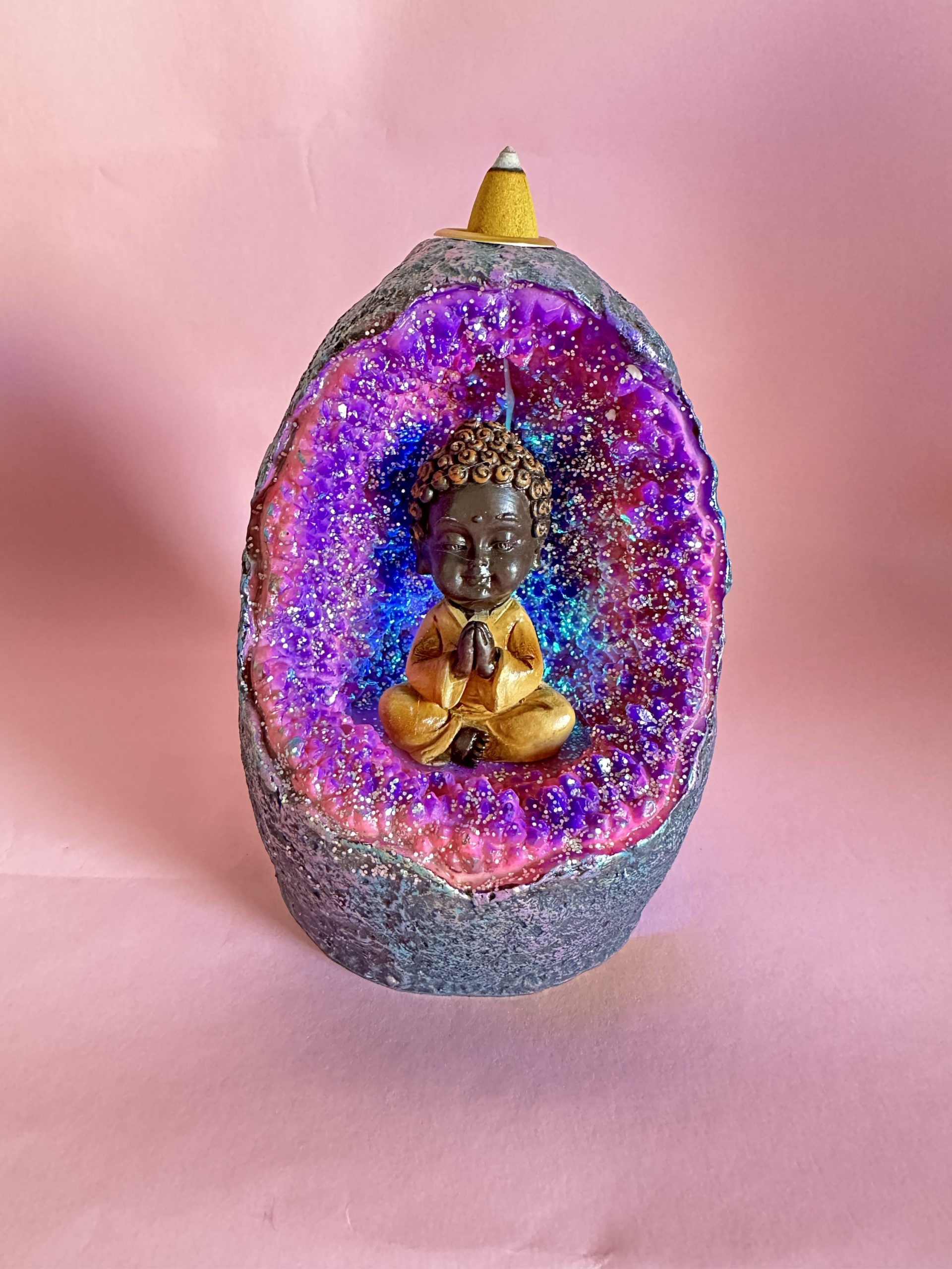 Pon el conito de incienso que más te guste, enciende las luces (funciona con pilas) y observa cómo cae el humito por el interior de la Geoda 😍