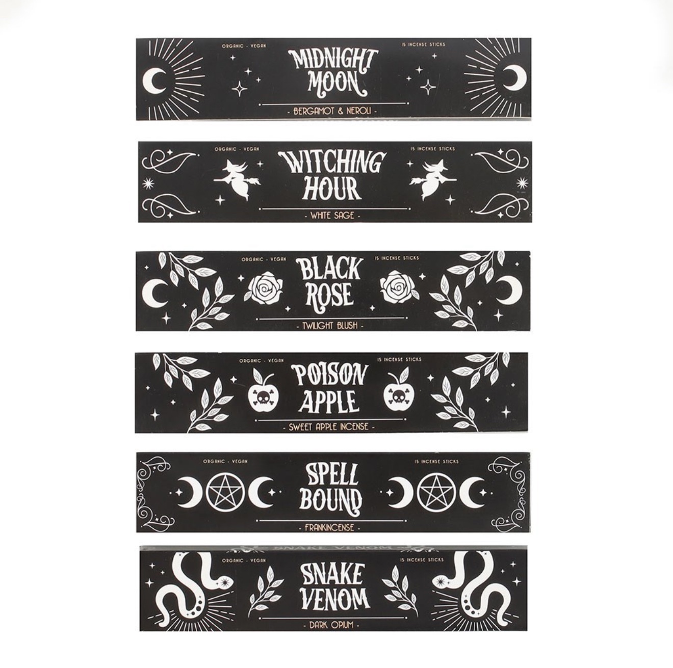 Elige entre los 6 paquetes de cada fragancia: Poison Apple, Spell Bound, Black Rose, Witching Hour, Midnight Moon y Snake Venom. Cada paquete individual contiene 15 barras de incienso, enrolladas a mano en la India utilizando ingredientes y fragancias de la más alta calidad. Apto para veganos.