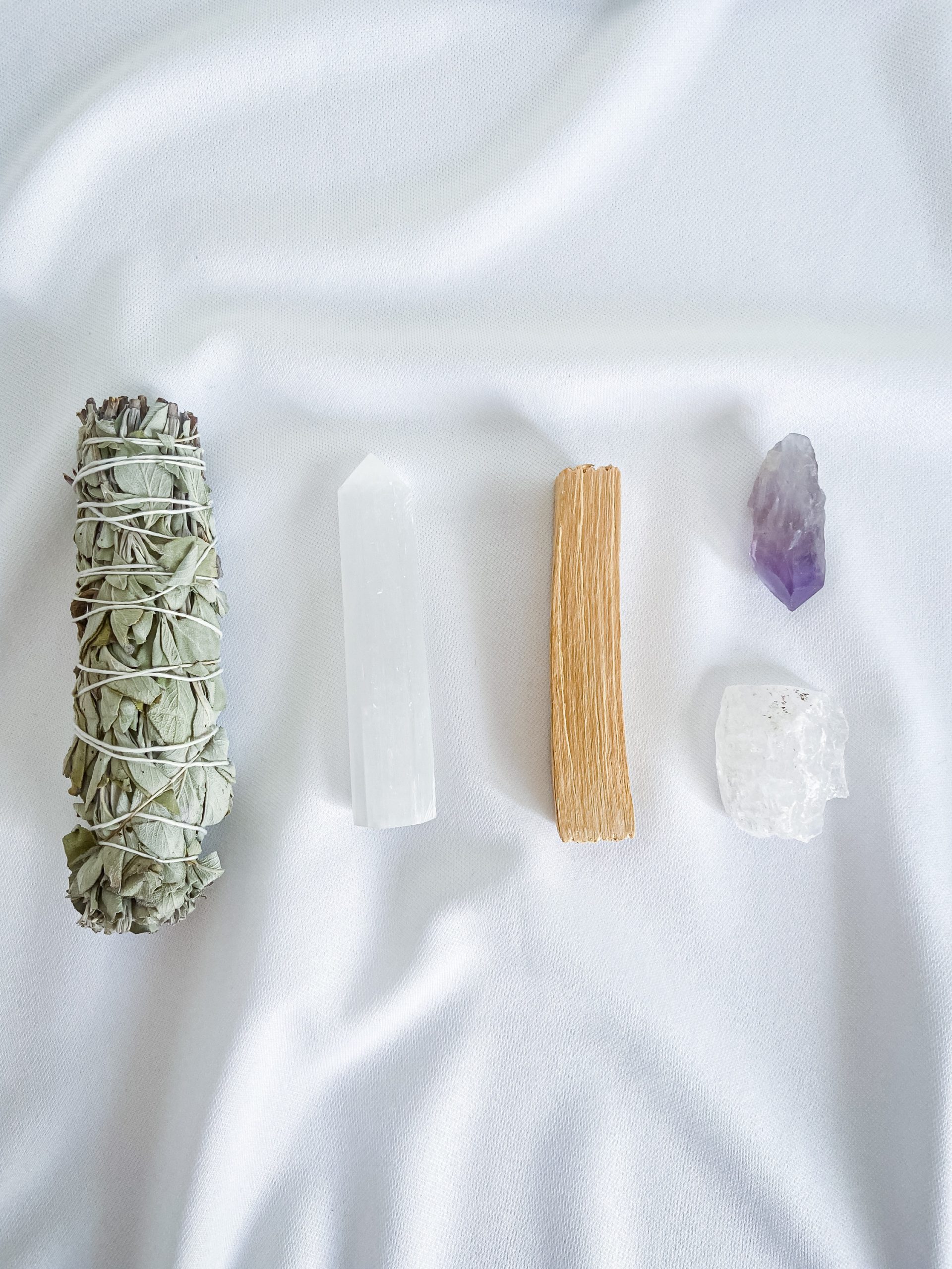 Compuesto de un sahumerio de Salvia o Lavanda, un palo Santo, una varita de Selenita, un masivo o rodado de Cuarzo Cristal y una punta o rodado de Amatista 💜